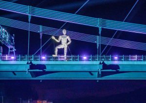 Anlässlich der Eröffnung der weltweit größten freischwebenden Brücke von 306 Metern organisierte die Agentur Brandmood für die Asfinag eine Inszenierung von Beda Percht, künstlerischer Leiter, Produzent und Regisseur. Von drei Schiffen aus konnten die rund 2.500 geladenen Besucher:innen eine spektakuläre Licht- und Klangshow verfolgen. Die Geschichte: DercLichtriese war seit Jahrhunderten im Berg gefangen und konnte nun endlich über die Brücke in seine geliebte Stadt flanieren. In strahlender Licht-Show von Noisegate, mit den neuesten moving lights Robe ibolt, iforte, Forte ltx und Roxx neo, bewegte sich der Riese zu stimmungsvoller Musik auf der Donautalbrücke.