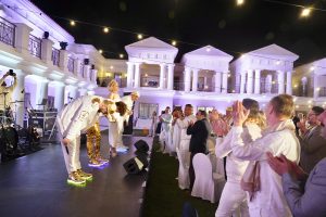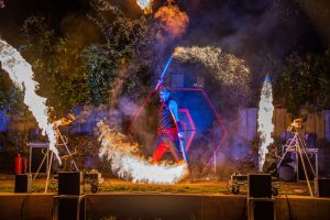 Ob für Veranstaltungen, Galas oder Festivals – die Feuershow »Fusion Fire« von Modern Juggling begeistert mit einer Kombination aus moderner Jonglage, Tanz und innovativen Feuereffekten, vereint in einer aufwendig inszenierten Produktion. Zentrales Element ist ein brennendes Hexagon, das nicht nur als visuelle Kulisse dient, sondern aktiv in die Jonglage eingebunden wird. Neue Requisiten, darunter Feuerstäbe und ein brennendes Schwert, erweitern das klassische Repertoire. Ursprünglich aus einer asiatisch inspirierten Show-Idee entstanden, entwickelte sich das Konzept stetig weiter und wurde durch verschiedene Einflüsse ergänzt. Neben den artistischen Elementen kommt auch modernste Veranstaltungstechnik zum Einsatz – darunter Flammenprojektoren und Sparkular-Fontänen, die das visuelle Erlebnis verstärken.