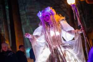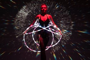 Wenn sich Live-Lightpainting-Projektion mit einer LEDHula-Hoop-Performance vereint, ist eines garantiert: ein raumfüllendes Kunstwerk mit einer intensiven visuellen Wirkung. Die Show “Beflügelt” von Kristin Lahoop verbindet virtuose Hula-Hoop-Artistik mit dem Live Lightpainting des Künstlers Jome Art. Die Muster der programmierten LED-Hula-Hoops werden von einer Kamera aufgenommen und zeitgleich auf eine Leinwand projiziert, wodurch die entstehenden Bilder noch intensiver wirken. Das Publikum taucht in eine futuristische Welt ein, in der Planeten und Schmetterlinge zu einem spielerischen Dialog verschmelzen. Der Höhepunkt der Show wird durch das Finale mit fünf leuchtenden Reifen gesetzt. Ob für Galas, Kulturveranstaltungen oder Firmenevens – die Show kann durch interaktive Module wie eine Hula-Hoop-Mitmachstation oder Lightpainting-Fotografie ergänzt werden.
